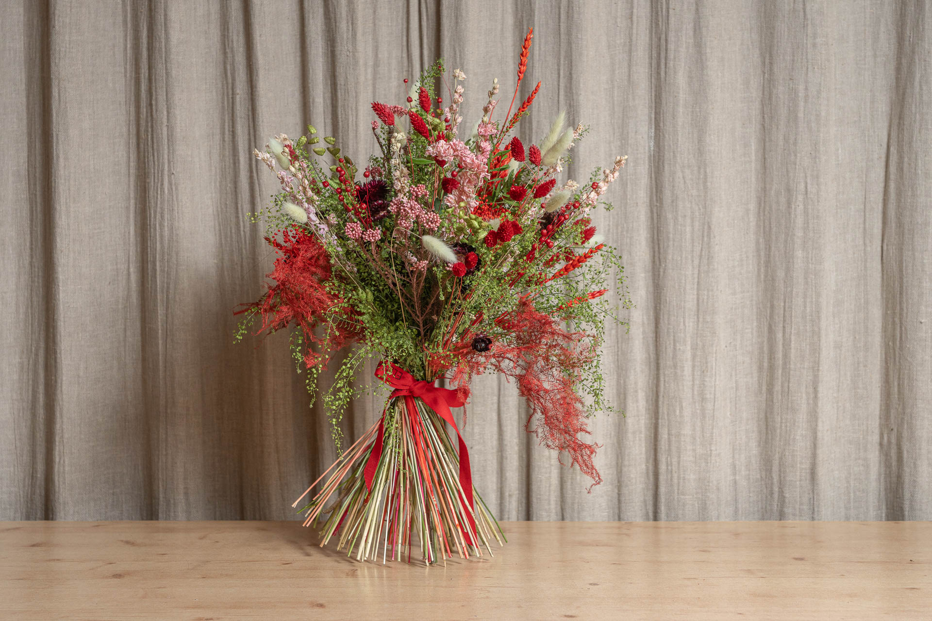 Ramo de flores preservadas cuidadosamente seleccionadas por nuestros maestros floristas para la ocasión en tonos rojos/rosas. Se envía a península y baleares en nuestras cajas especialmente diseñadas para el transporte de flores. La imagen corresponde al tamaño mediano.
